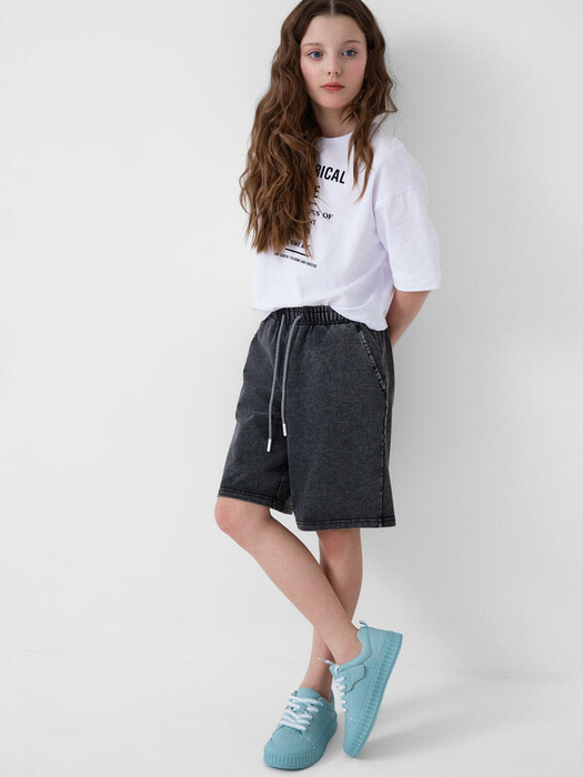 Шорты бермуды для девочки подростка. Модель свободного кроя. Материал визуально похож на деним, но имеет все качества хлопкового трикотажа. Удобная посадка обеспечивается эластичным поясом со шнуром. Спереди — боковые карманы.