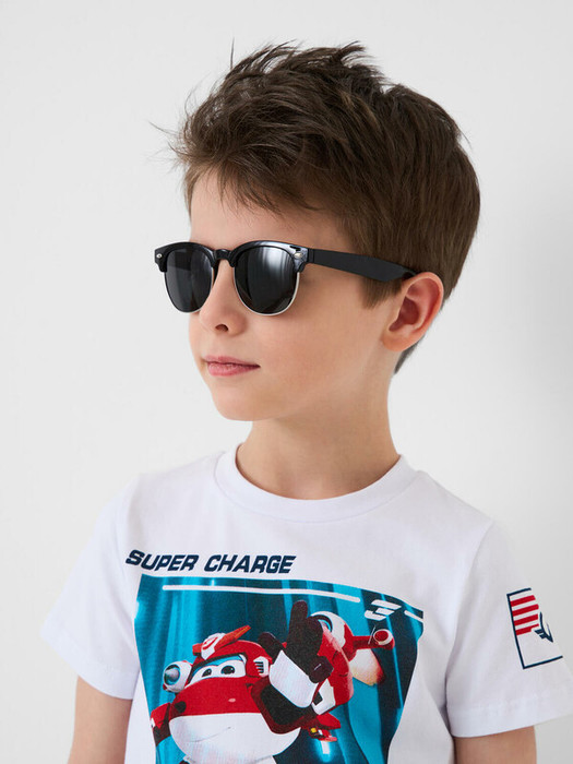 Солнцезащитные очки классической формы для мальчика. Оправа в стиле OLD SCHOOL подходит для мальчиков с крупными чертами лица. Оправа выполнена из поликарбоната и и антиаллергенного медного сплава. Солнцезащитные очки с фильтром Cat3 и поляризацией. Тёмные линзы имеют защиту UV400, которая отражает 100% ультрафиолетовых лучей с длиной волны менее 400 нанометров, эффективно блокируя все ультрафиолетовые лучи при солнечном свете. Ширина оправы - 126 мм, длина дужек - 121 мм. Обхват головы 50-52 см. Небьющиеся линзы из триацетата целлюлозы устойчивы к царапинам. Поляризационные фильтры на очках поглощают блики, отражаемые от горизонтальных поверхностей, что помогает повысить четкость зрения и избежать напряжения глаз ребенка. Только при просмотре в линзах с поляризацией видны воздушные шарики в виде сердечек на тест-картинке, вложенной в чехол.  Такие очки эффективны для защиты глаз в тропиках, у моря и в горах. В комплекте: текстильный чехол, тест-картинка со слониками. Текстильный чехол выполнен из микрофибры и им легко ухаживать за изделием. Очки транспортируются в картонной коробке.