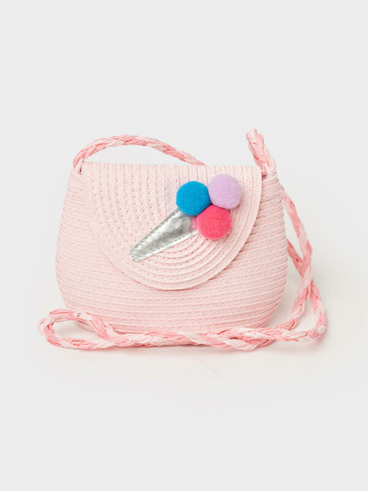 Пляжная сумка кросс-боди для девочки. Маленькая сумочка из искусственной рафии декорирована объемной аппликацией мороженое. Сумка имеет одно отеделение, которое закрывается наклапан с кнопкой. Параметры сумки: высота - 12 см, ширина - 18 см, глубина - 7 см