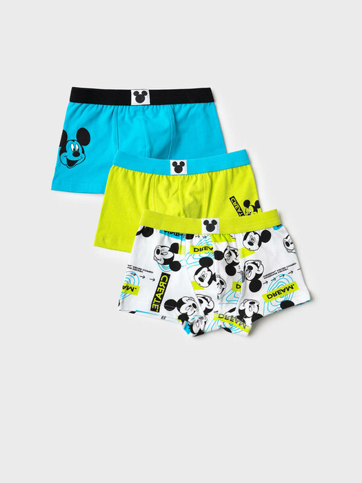 Набор из трех детских трусов-боксеров для мальчика. Изделие плотно прилегает к телу, не имеет боковых швов, что делает его особенно комфортным. Эластичный пояс с логотипом бренда обеспечивает надёжную посадку. Принт с любимым мультяшным героем - Микки Маус. Материал — мягкий хлопковый трикотаж, приятный к телу.