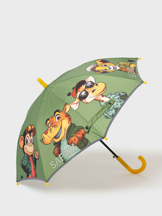Зонт-трость для мальчика с героями сафари. Зонт идеально сочетается с резиновыми сапогами из коллекции. По краю зонта имеется светоотражающая окантовка, поэтому в темное время суток ребенка с зонтом хорошо видно на дороге. Длина 67 см, диаметр купола 76 см. Механизм складывания - полуавтомат.