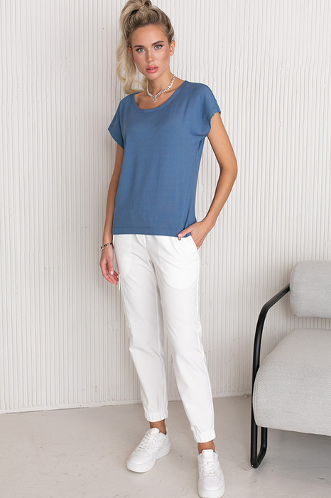 Брюки из костюмной ткани, чуть зауженные книзу. В боковых швах выполнены карманы с подкройным бочком и клапанами. Пояс с эластичной резиной. На передней части брюк имитация гульфика, на бедре-оригинальный карман с клапаном. Низ брюк на резинке.