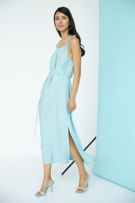 Платье из вискозной ткани с крэш-эффектом. Изделие свободного силуэта, расширенное книзу, с разрезом в боковом шве. Горловина собрана на кулиску, переходящую в бретель. Линия проймы окантована косой бейкой из основной ткани. В комплекте пояс из основной ткани.