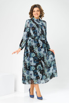 Платье свободного силуэта из плательной ткани. Изделие отрезное по линии талии с резинкой. Лиф платья с запахом, фиксируется на пуговицу для удобства. На передней части юбки выполнена складка, имитирующая запах, в боковых швах карманы. Линия горловины оформлена воротником-стойкой. Втачной короткий рукав. В комплекте пояс из основной ткани.