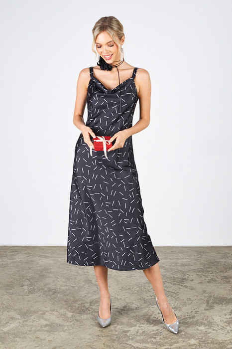Платье с «качелями» в зоне декольте смотрится очень женственно. Изделие на бретелях полуприлегающего силуэта, расширенное книзу из атласной плательной ткани.