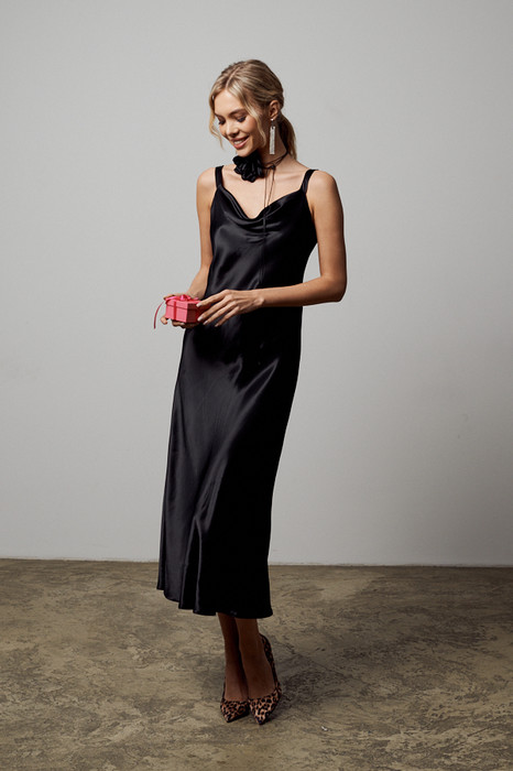 Платье с «качелями» в зоне декольте смотрится очень женственно. Изделие на бретелях полуприлегающего силуэта, расширенное книзу из вискозной ткани с сатиновым блеском.