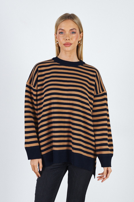 Джемпер очень свободного силуэта со спущенной линией плеча и длинным рукавом. Низ изделия асимметричной длины (спинка удлинена относительно переда) с разрезами по бокам. Круглый вырез горловины, низ изделия и низ рукава оформлены резинкой. Изделие выполнено из мягкой структурированной пряжи.