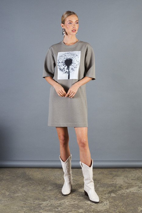 Платье свободного силуэта из эластичного полотна. Короткий втачной рукав в спущенную пройму. Вырез горловины оформлен бейкой. На передней части изделия выполнена аппликация.