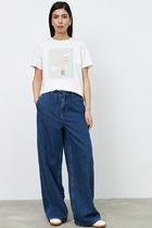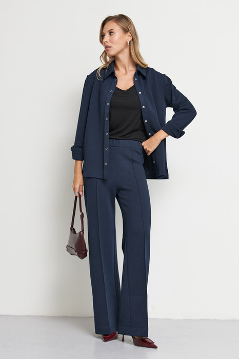 Брюки выполнены из эластичного полотна. Брюки прямого силуэта. Пояс притачной с эластичной резиной. На передней части брюк застрочены стрелки.