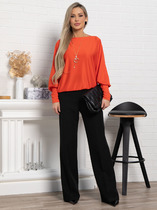 Рубашка свободного силуэта с застёжкой на пуговицы из вискозной ткани. Низ изделия асимметричной длины (спинка удлинена относительно переда) с закруглениями по бокам. Вырез горловины обработан отложным воротником на стойке. Рубашечный рукав на манжете с застёжкой на пуговицы. На задней части изделия выполнена кокетка с небольшой складкой. Достоинство этой модели - в способности скрыть некоторые недостатки фигуры. Её можно сочетать как с брюками, так и с джинсами.