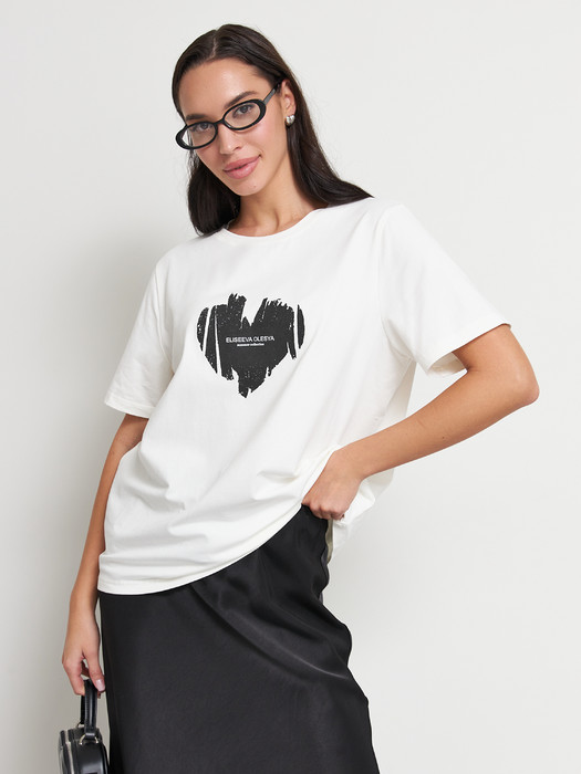 Джемпер свободного силуэта из хлопкового эластичного полотна. Втачной короткий рукав. Круглый вырез горловины оформлен бейкой. На передней части изделия нанесён принт методом шелкографии.