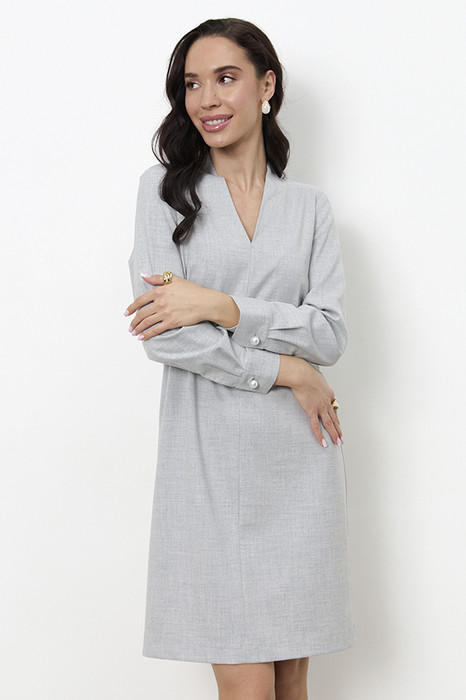 Платье свободного силуэта из плательной ткани. По центру передней части изделия выполнен шов. Цельнокроеная стойка, переходящая в V-образный вырез горловины, визуально делает фигуру стройнее. Втачной длинный рукав. Низ рукава на манжете с застёжкой на пуговицы-жемчужины.