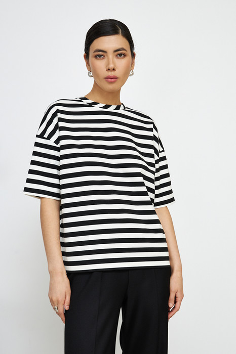 Джемпер свободного силуэта со спущенной линией плеча и рукавом до локтя выполнен из эластичного полотна. Вырез горловины оформлен бейкой из основной ткани. В таблице размеров представлены параметры человека, а не изделия.