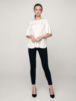 Блуза свободного силуэта из блузочной ткани. Низ изделия асимметричной длины (спинка удлинена относительно переда) с разрезами в боковых швах. Втачной рукав в спущенную пройму. V-образный вырез горловины оформлен косой бейкой из основной ткани.