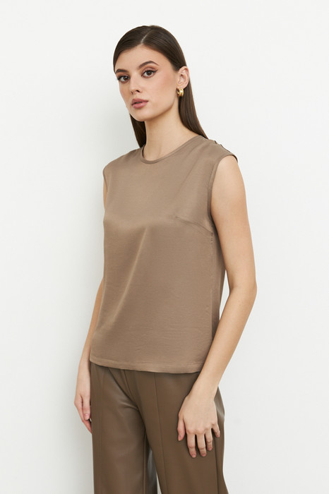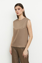 Топ из вискозной ткани с сатиновым блеском. Свободный силуэт, с небольшими разрезами в боковых швах. Круглый вырез горловины и линии проймы окантованы косыми бейками из основной ткани.