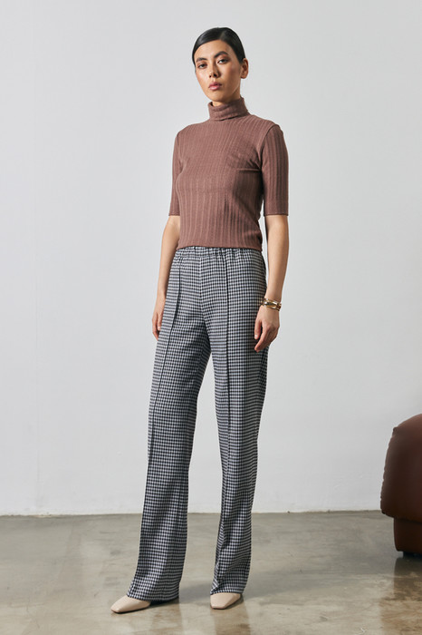 Брюки прямого силуэта из костюмной ткани. Пояс притачной с эластичной резиной. На передней части брюк застрочены стрелки.