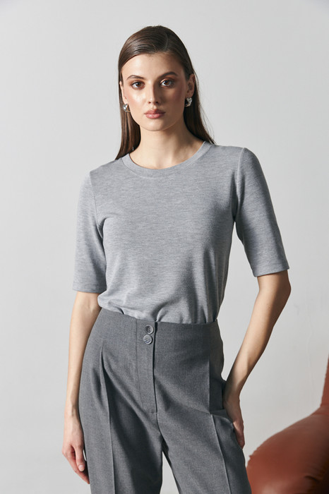 Джемпер прилегающего силуэта из меланжевого эластичного полотна. Втачной короткий рукав. Круглый вырез горловины оформлен бейкой. Джемпер – это хорошая базовая вещь, подходящая для любого гардероба.