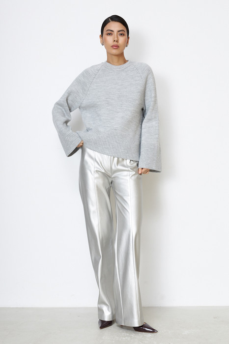 Брюки прямого силуэта из эластичного полотна, с покрытием, имитирующим кожу. По центру передней части брючин выполнен шов с декоративной строчкой. Пояс с эластичной резиной.