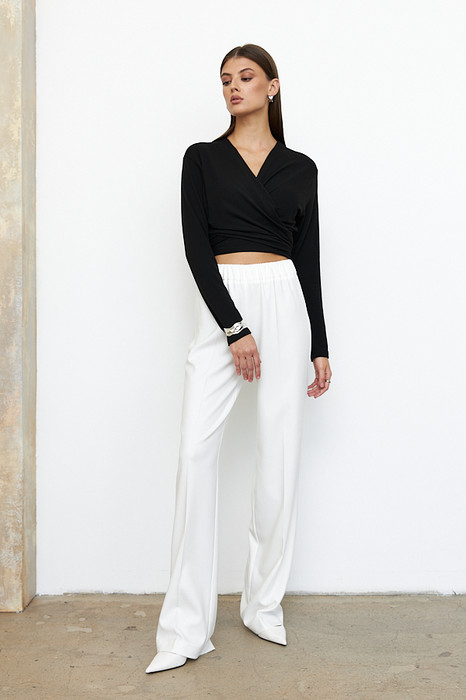 Брюки прямого силуэта из костюмной ткани. Пояс притачной с эластичной резиной.