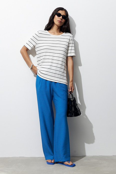 Брюки прямого силуэта из вискозной ткани с крэш-эффектом. Пояс с эластичной резиной и кулиской, в боковых швах карманы.