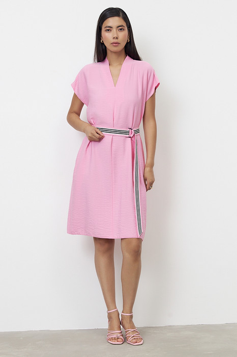 Платье из вискозной ткани с крэш-эффектом. Свободный силуэт с карманами в боковых швах. По центру передней и задней части изделия выполнен шов. Цельнокроеная стойка, переходящая в V-образный вырез горловины, визуально делает фигуру стройнее. Цельнокроеный короткий рукав. В комплекте пояс из основной ткани с декоративной тесьмой.