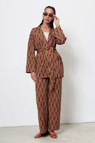 Брюки из эластичного полотна прямого силуэта. Пояс с эластичной резиной. На передней части брюк застрочены стрелки.