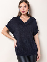 Джемпер свободного силуэта со спущенной линией плеча и рукавом до локтя выполнен из эластичного полотна. Вырез горловины оформлен бейкой из основной ткани. На передней части изделия выполнена аппликация. В таблице размеров представлены параметры человека, а не изделия.