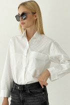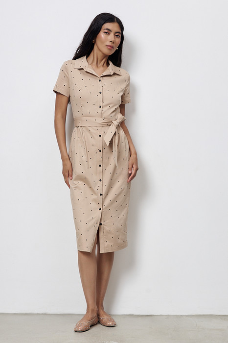 Платье приталенного силуэта из хлопковой плательной ткани. Изделие отрезное по линии талии с защипами. В боковых швах карманы. Втачной короткий рукав. Притачная планка с застёжкой на пуговицы. Вырез горловины обработан отложным воротником на стойке. В комплекте пояс из основной ткани.