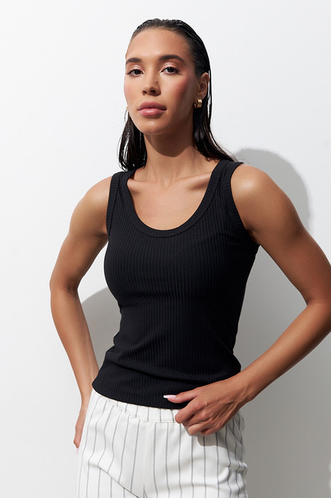 Топ на лямках из эластичного полотна в рубчик. Прилегающий силуэт. Линия горловины и линия проймы окантованы эластичной бейкой.