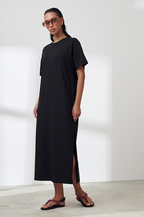 Платье из хлопкового эластичного полотна. Свободный силуэт с разрезами в боковых швах. Короткий втачной рукав в спущенную пройму. Вырез горловины оформлен бейкой.