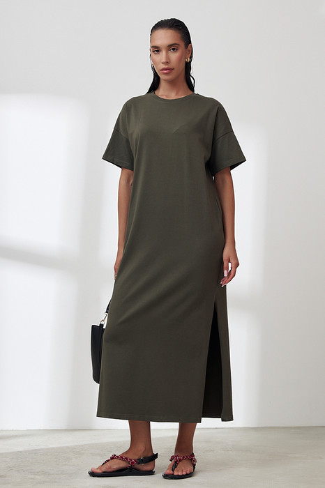 Платье из хлопкового эластичного полотна. Свободный силуэт с разрезами в боковых швах. Короткий втачной рукав в спущенную пройму. Вырез горловины оформлен бейкой.