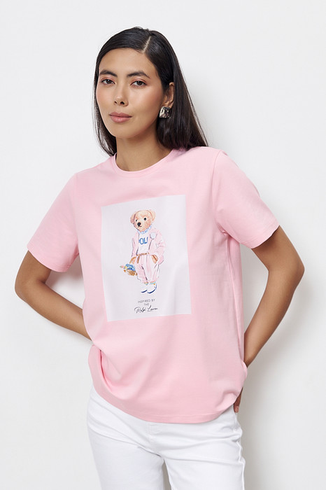 Джемпер из хлопкового эластичного полотна свободного силуэта. Втачной короткий рукав. Круглый вырез горловины оформлен бейкой. На передней части изделия нанесён принт методом шелкографии.