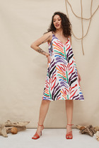 Платье из вискозной ткани с крэш-эффектом полуприлегающего силуэта. По центру передней части изделия выполнен шов, снизу разрез. V-образный вырез горловины и линия проймы оформлены косыми бейками.