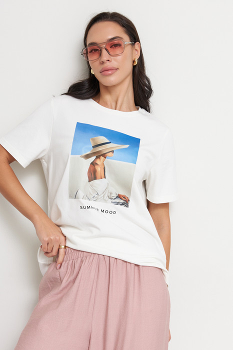Джемпер из хлопкового эластичного полотна свободного силуэта. Втачной короткий рукав. Круглый вырез горловины оформлен бейкой. На передней части изделия нанесён принт методом шелкографии.