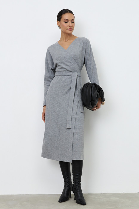 Платье отрезное по линии талии из фактурного эластичного полотна. Изделие свободное в верхней части и полуприлегающее в области талии и бёдер. Глубокий V-образный вырез горловины плавно переходит в запах, фиксируется притачным поясом. Рукав оригинального кроя в стиле кимоно. В таблице размеров представлены параметры человека, а не изделия.