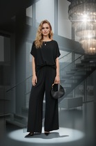 Брюки прямого силуэта из вискозной ткани с крэш-эффектом. Пояс с эластичной резиной, в боковых швах карманы.