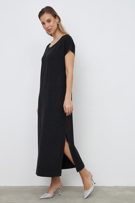 Платье из меланжевого эластичного полотна. Полуприлегающий силуэт, с разрезом в боковом шве. Цельнокроеный короткий рукав. Круглый вырез горловины.
