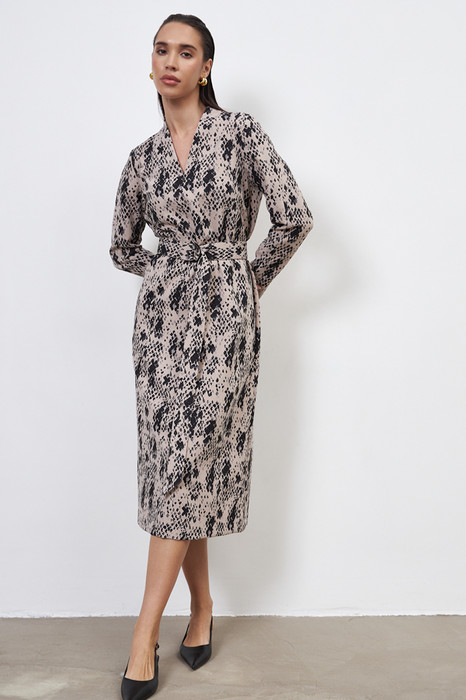 Платье свободного силуэта из плательной ткани. По центру передней части изделия выполнен шов. Цельнокроеная стойка, переходящая в V-образный вырез горловины, визуально делает фигуру стройнее. Втачной длинный рукав с центральным швом и декоративным разрезом по низу рукава. В комплекте пояс из основной ткани.