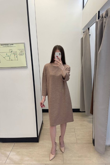 Платье из меланжевого эластичного полотна. Изделие свободного силуэта со спущенной линией плеча и длинным рукавом. Вырез горловины оформлен бейкой из основной ткани. В таблице размеров представлены параметры человека, а не изделия.