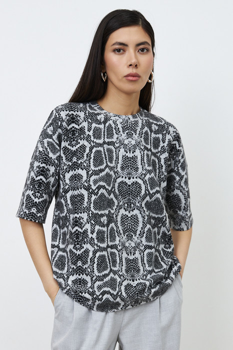 Джемпер свободного силуэта со спущенной линией плеча и рукавом до локтя выполнен из мягкого эластичного полотна. Вырез горловины оформлен бейкой из основной ткани. В таблице размеров представлены параметры человека, а не изделия.