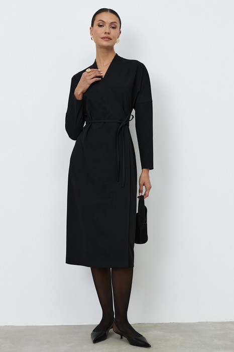 Платье прямого силуэта из плательной ткани. Глубокий V-образный вырез горловины плавно переходит в запах, фиксируется притачным поясом. Втачной длинный рукав в спущенную пройму.