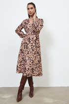 Платье свободного силуэта из плательной ткани. По центру передней части изделия выполнен шов. Цельнокроеная стойка, переходящая в V-образный вырез горловины, визуально делает фигуру стройнее. Втачной длинный рукав с центральным швом и декоративным разрезом по низу рукава. В комплекте пояс из основной ткани.