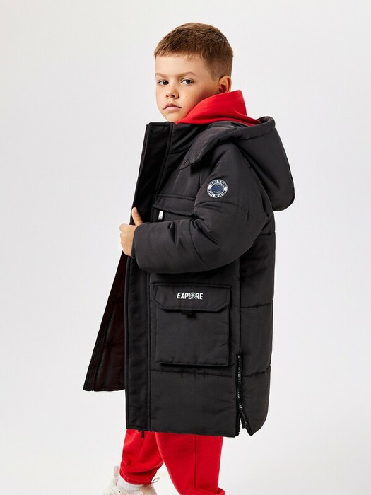 Детская утеплённая стеганая куртка для мальчика выполнена из водонепроницаемой ткани, что обеспечивает защиту от небольшого дождя, сырости и тумана. Подкладка выполнена из стандартной подкладочной ткани. Вид утеплителя – синтепон (вес 350г/м2). Рекомендованный температурный режим от +5 до -15 градусов. Застежка на двухстороннюю молнию с внутренней и внешней ветрозащитными планками защищает от проникновения холодного воздуха; внешняя планка с застежкой на кнопки. Модель с тремя карманами: двумя накладными и одним нагрудным карманом на молнии, что позволяет хранить необходимые мелочи. Капюшон с застежкой на кнопках избавляет от необходимости носить шарф. Спереди расположен текстовый принт "EXPLORE" англ. - "Исследовать", что придает изделию акцент. Рукав также дополнен нашивкой с принтом "LEARN TO TRAVEL | TRAVEL TO LEARN" англ. -"Научитесь путешествовать | Путешествуйте, чтобы учиться". Трикотажные манжеты обеспечивают лучшее прилегание к телу и сохранение тепла. Комбинируйте куртку в темно-сером цвете со свитшотом (20120580027) и спортивными брюками (20120460121), чтобы собрать теплый и стильный лук. Рост модели на фото 114,5.