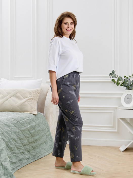 Брюки женские из трикотажного полотна «кулирка» с набивным рисунком, прямого кроя слегка зауженные книзу, с карманами в боковых швах, на притачном поясе с эластичной тесьмой внутри.