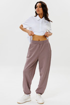 Брюки прямые. Верх на поясе со шлёвками. Пояс декорирован съёмным поясом на петли и пуговицы.  Застёжка по переду на молнию и крючок на поясе. Боковые наклонные карманы. Низ брюк на манжете.
