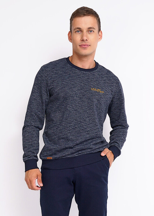 Стильный мужской джемпер из текстурированного трикотажного полотна футера с меланжевым эффектом. Изделие с круглым вырезом горловины и длинным рукавом на вязаной манжете, в качестве отделки кожаная нашивка. Отличный вариант на каждый день.