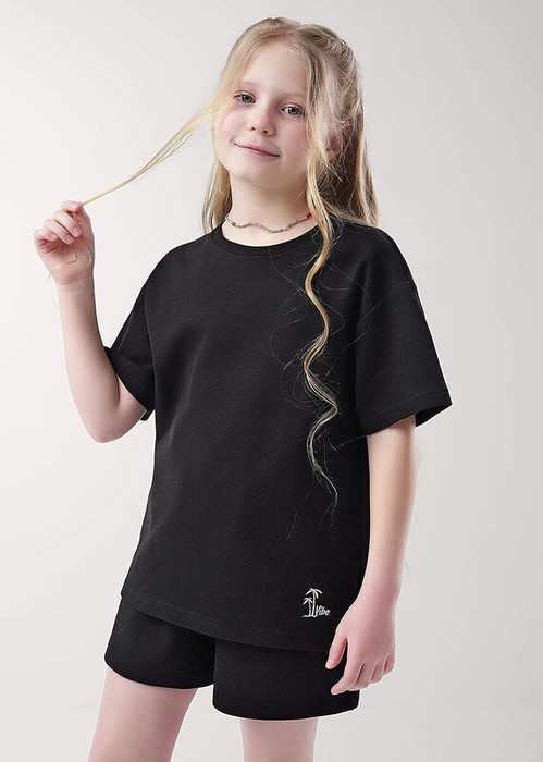 футболка среднего обьема из трикотажного ""вафельного"" полотна. Горловина оформлена эластичной обтачкой из основы. Спереди вышивка в летней тематике.