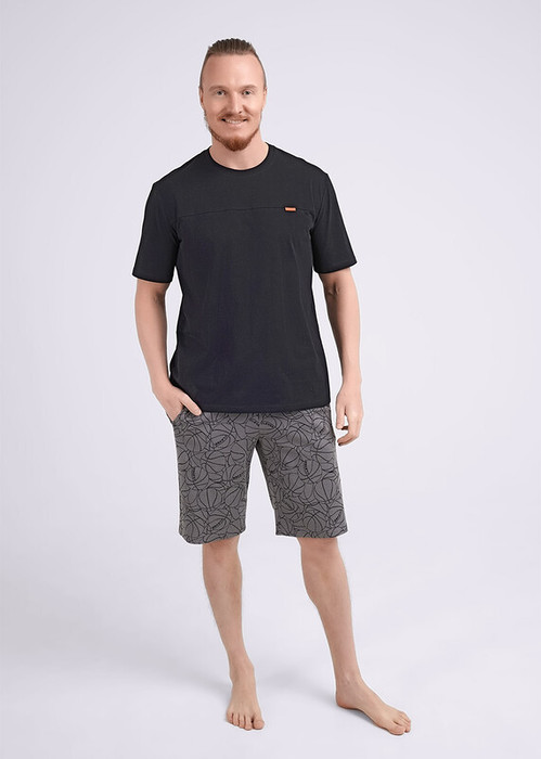 Комплект мужской для дома состоящий из футболки и шорт. Футболка из трикотажного полотна с кокеткой, круглым вырезом горловины и коротким рукавом. Шорты из фактурного полотна на эластичном поясе с функциональными карманами и шнуром.