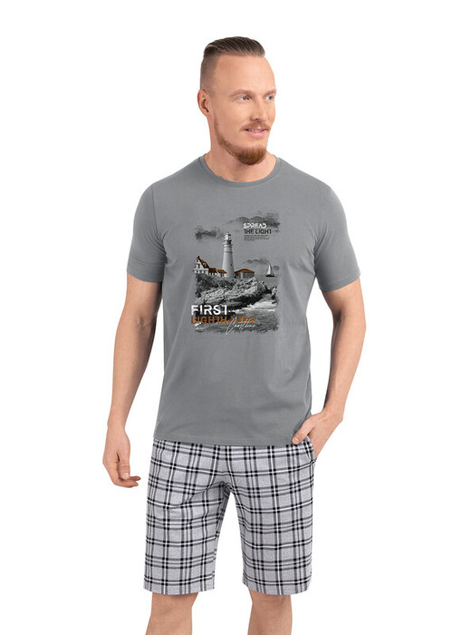 Комплект мужской домашний, состоящий из футболки и шорт. Футболка из трикотажного полотна с круглым вырезом горловины и коротким рукавом дополнена стильным принтом. Шорты из трикотажного полотна на эластичном поясе с функциональными карманами и шнуром.