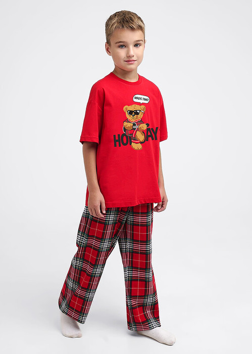 Стильная новогодняя пижама,состоящая из футболки и брюк. Футболка свободного кроя спереди украшена оригинальным тематическим принтом. Брюки прямые выполнены из хлопкового полотна в клетку.